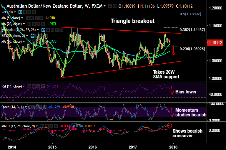 - The pair is trading in a symmetric triangle pattern on weekly charts, and technical indicators support downside.