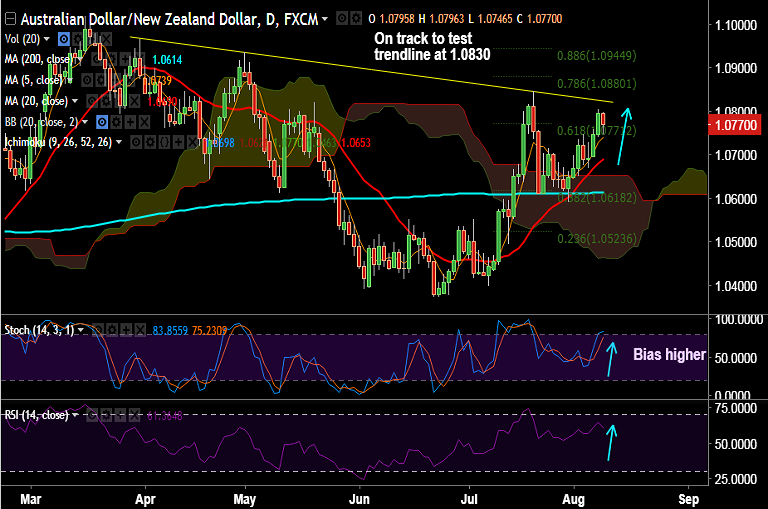 Call update: Our previous long call (http://www.econotimes.com/FxWirePro-AUD-NZD-breaks-100-DMA-at-10671-eyes-trendline-at-10830-stay-long-833838) has hit TP1&2.