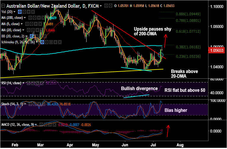 - AUD/NZD was rejected shy of 200-DMA at 1.0609 levels. The pair has edged lower to currently trade at 1.0565 levels.