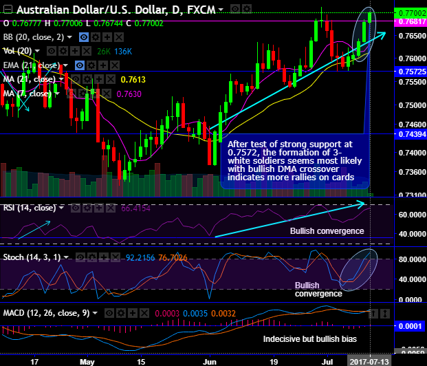 After the test of strong support at 0.7572, should the rallies extend from the current levels, the formation of 3-white soldiers seems most likely and this bullish pattern with bullish DMA crossover indicates more rallies on cards (on the daily chart).