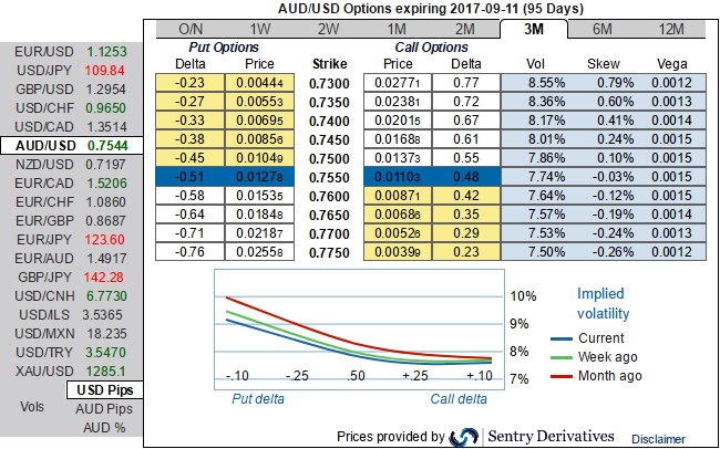 While delta risk reversal reveals divulge more interests in hedging activities for downside risks even though we see the positive shift in hedging arrangements. As a result, we can understand ATM puts have been costlier where the spot FX market direction of this pair is heading towards 0.74-75 or below technical levels. So, the speculators and hedgers for bearish risks are advised to optimally utilize the upswings and bid on 1-3m risks reversals that would encompass Fed’s June meeting.