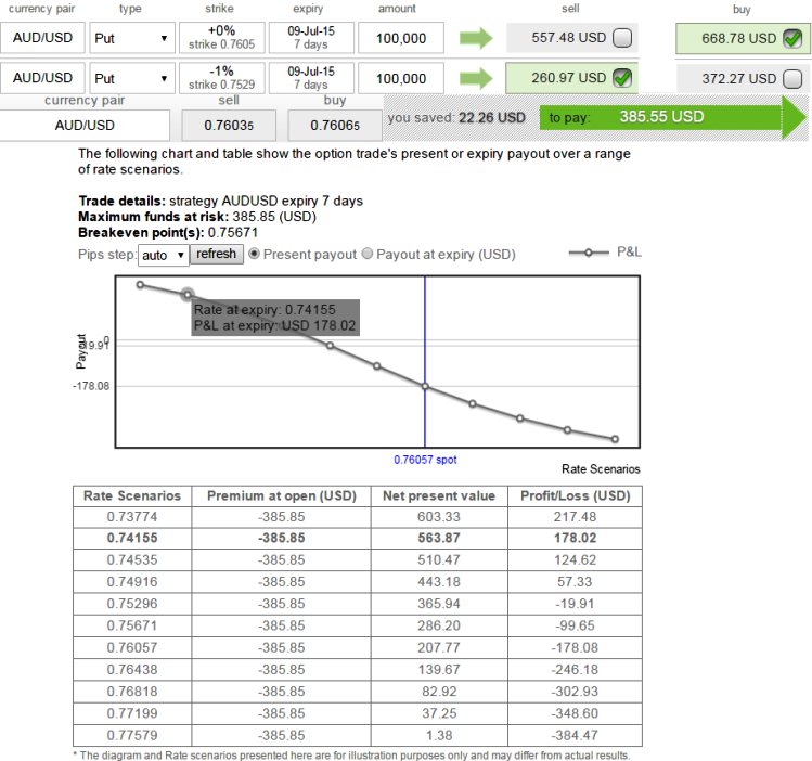 The strategy reads this way, buy 7D ATM -0.5 delta put option and sell another (-1%) OTM put with the similar maturity for a net debit as shown in the diagram. The spread position should have -0.19 delta value.