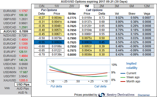 Please be noted that the positively skewed IVs of 1m tenors signify the hedgers’ interests to bid OTM put strikes upto 0.7775 levels (refer above diagram).