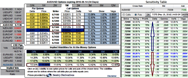 OTC IVs and sensitivity table, we consider 1M ATM IVs at 12.00% at spot FX 0.7332 levels which is still the highest among G10 currency pool and 11.89% for 1W tenors.