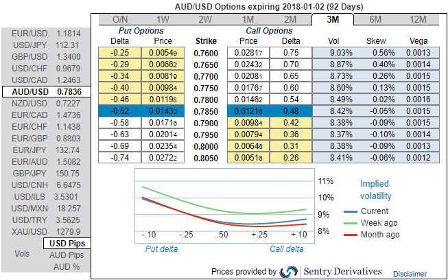 Well, the bearish stance has been substantiated by AUDUSD's rising IV in 1-3m which is an opportunity for put longs in long-term and using shrinking IVs of shorter tenors with bearish neutral delta risk reversal can be interpreted as an opportunity for writing OTM puts or theta shorts in short run on time decay advantage as the spot FX market reckons the price has downside potential for large movement in the days to come which is resulting option holders’ on competitive advantage.