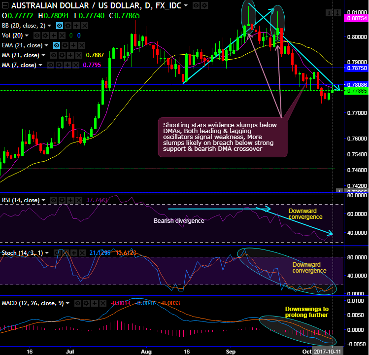 Hence, contemplating above technical rationale, at spot reference: 0.7784, upon breach below 0.78 the intraday speculators can easily eye on minimum southward targets upto 0.7745 levels, thus, snap rallies and deploy one touch binary puts.