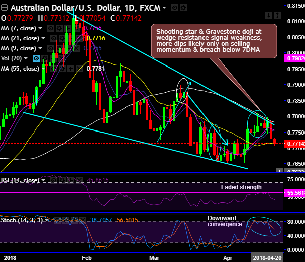 Shooting star and Gravestone doji patterns have occurred at wedge resistance signal weakness (see circled area), more dips seem to be likely only on the breach below 7DMA and the intensified selling momentum (refer daily chart).