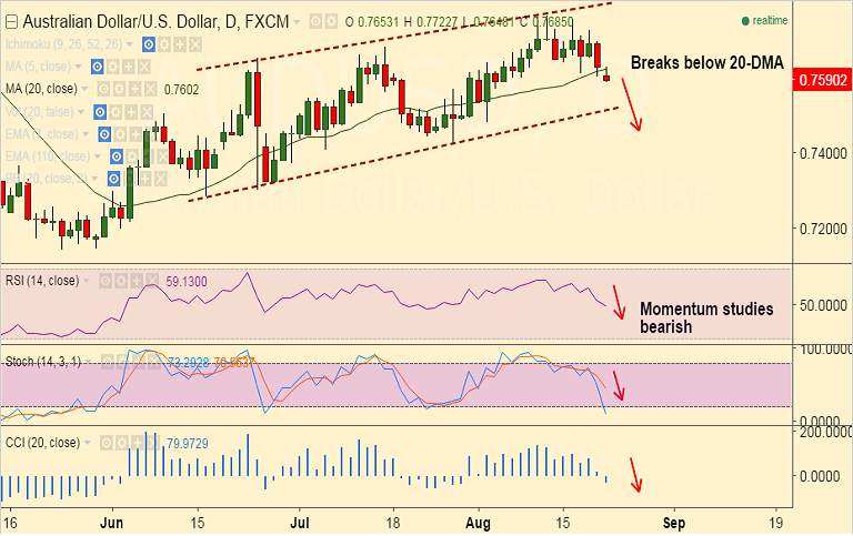 - The pair has broken below major support by 20-DMA at 0.7617 and has slipped below the 0.76 handle.