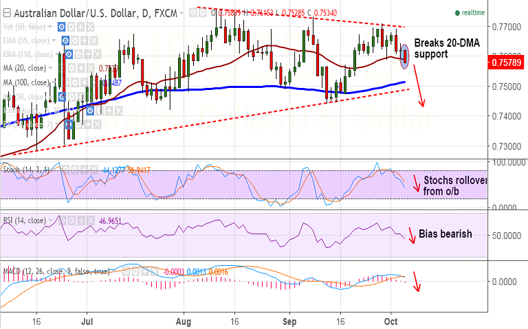- Technicals are bearish, the pair has breached 20-DMA support at 0.7589, on track to test 100-DMA at 0.7514.