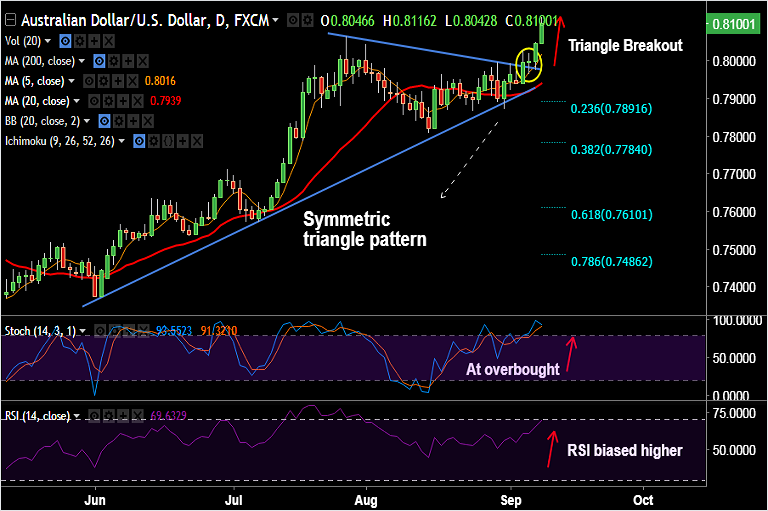 - AUD/USD has shown a breakout of 'Symmetric Triangle' pattern. We see scope for further upside.