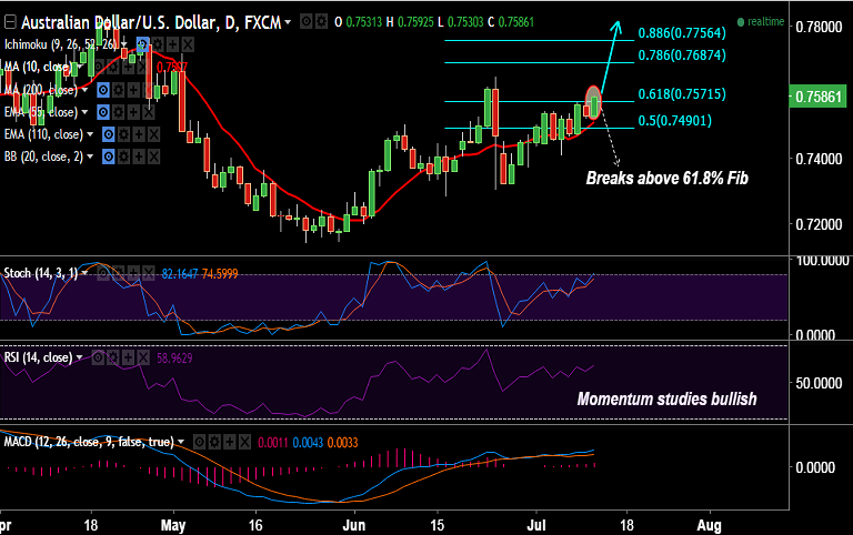 - Support on the downside is seen at 0.7536 (5-DMA), 0.7508 (10-DMA) and then 0.7490 (50% Fib).