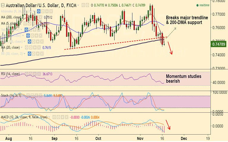 - The pair has broken major trendline and 200-DMA support at 0.7525 and 0.7510 respectively on Wednesday's trade.