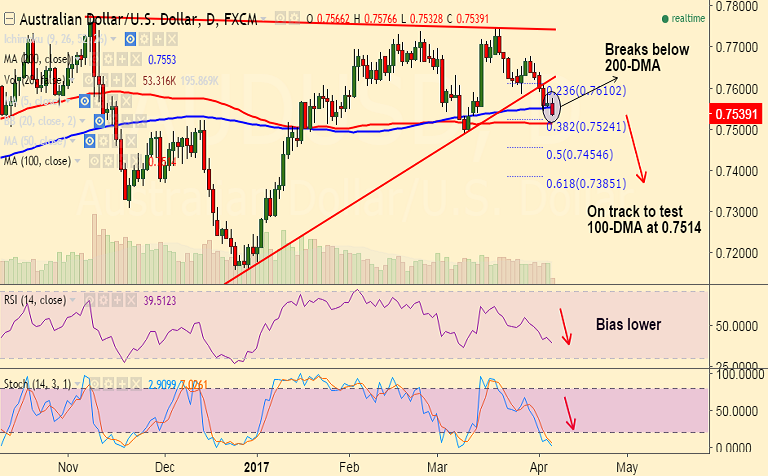 Resistance levels - 0.7553 (200-DMA), 0.7610 (23.6% Fib), 0.7631 (50-DMA), 0.7679 (Mar 30 high), 0.7710 (Sept 29, 2016 high)