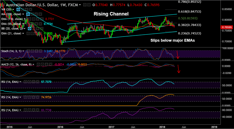 - AUD/USD is trading in a rising channel on weekly charts and weakness in technical indicators raises scope for test of channel base at 0.7450.