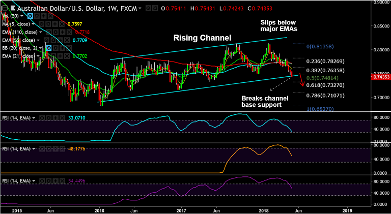 Resistance levels - 0.7450 (channel base), 0.7494 (5-DMA), 0.75