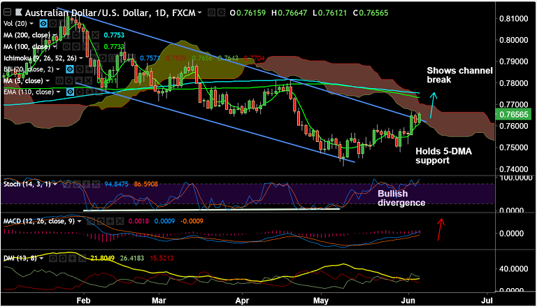Support levels - 0.7611 (5-DMA), 0.7604 (50-DMA), 0.7575 (21-EMA)