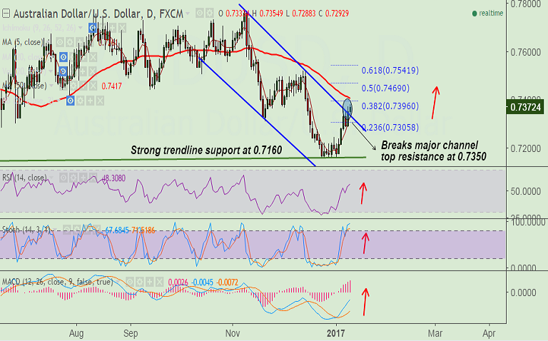 - AUD/USD has broken major channel top resistance at 0.7350, intraday bias higher.