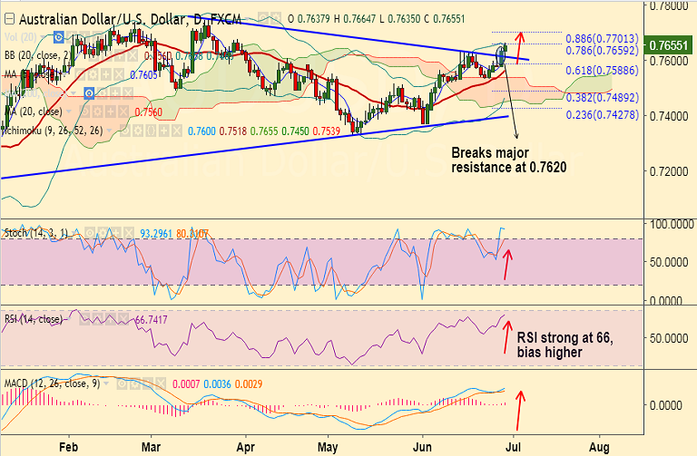 - AUD/USD has broken above major resistance at 0.7620, bias higher.