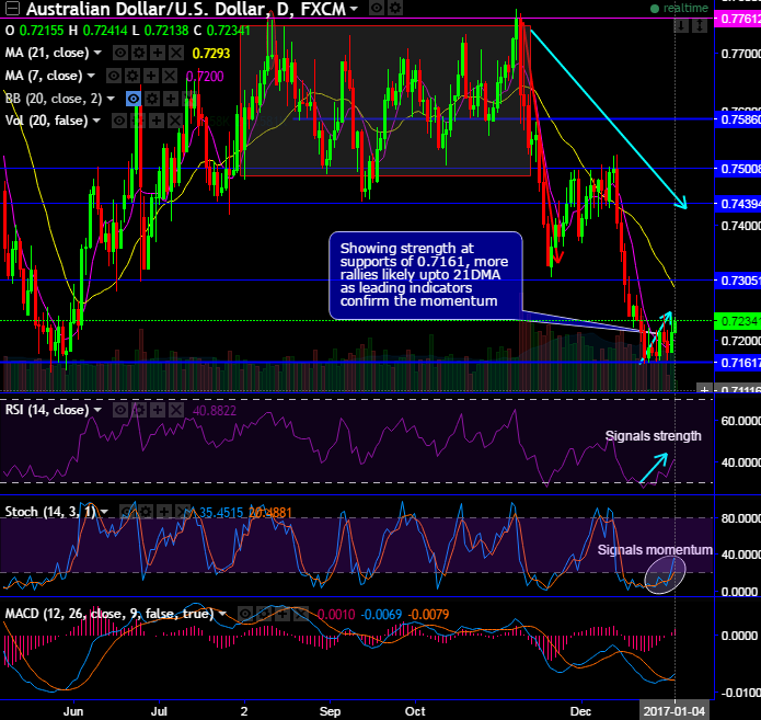 AUDUSD bulls break-out minor resistance of 7DMA after testing supports of 0.7161 levels, showing strength at this supports of 0.7161, more rallies likely up to 21DMA as leading indicators confirm the momentum.