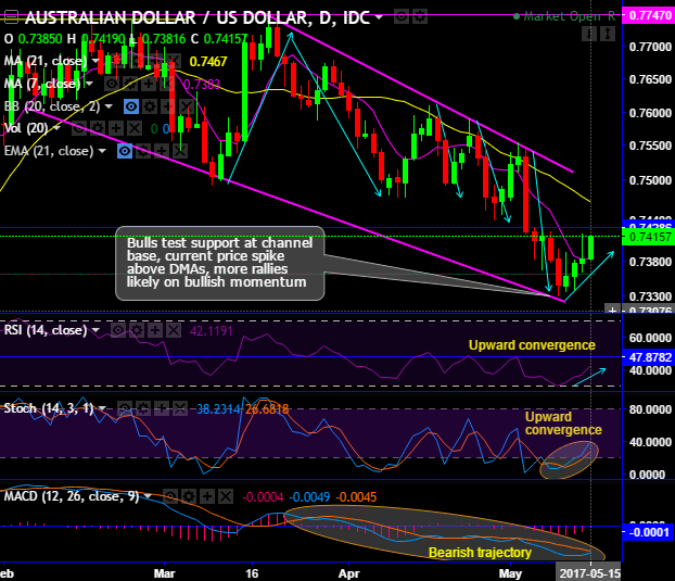 AUDUSD bulls test after channel base, current price spike above DMAs, more rallies likely on bullish momentum indicated by both leading oscillators.