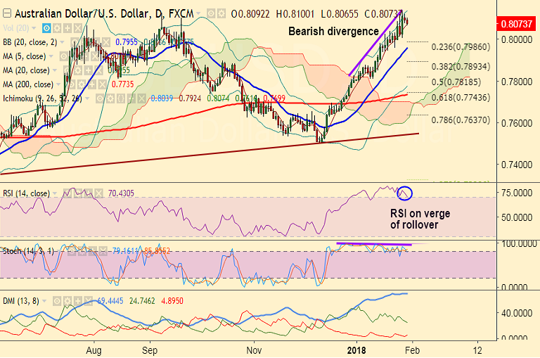 - The major pauses its stellar rally, edges lower from 2-1/2 year highs at 0.8035.