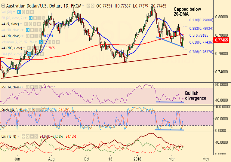 - 20-DMA at 0.7791 is immediate resistance. Break above could see test of 200-DMA at 0.7805.