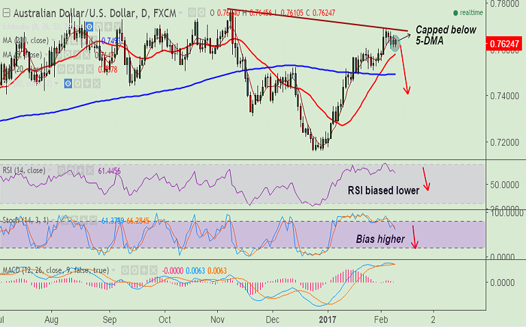 - Resistance levels - 0.7647 (5-DMA), 0.7685 (trendline), 0.7696 (Feb 2 high)