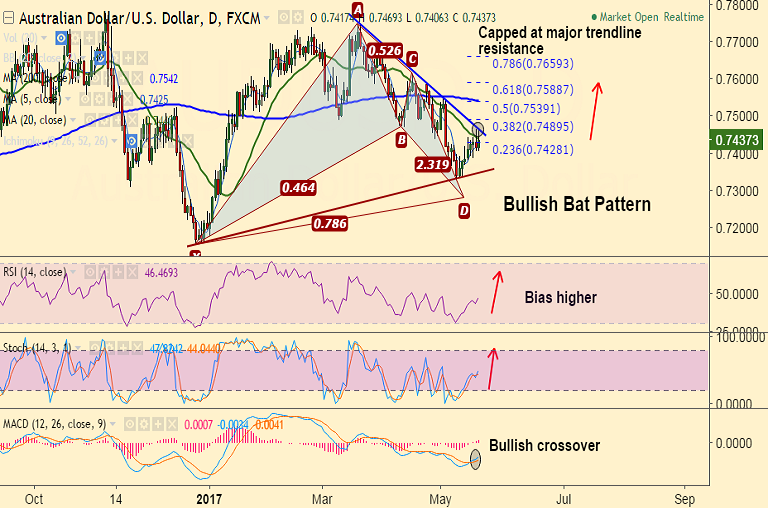 - On the flipside, break above trendline resistance at 0.7470 could see resumption of upside in 'Bullish Bat Pattern'.