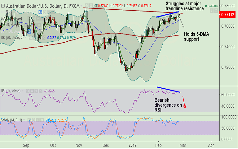 Support levels - 0.7698 (5-DMA), 0.7657 (20-DMA), 0.7603 (23.6% Fib retrace of 0.7160 to 0.7740 rally)