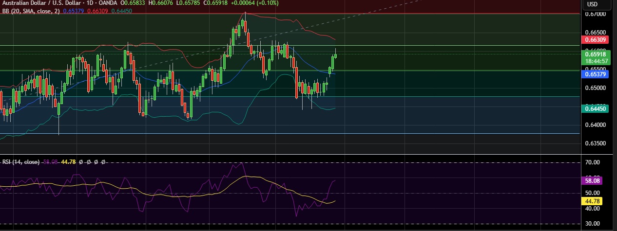 • Immediate resistance is located at 0.6614 (38.2%fib), any close above will push the pair towards 0.6631(Higher BB).