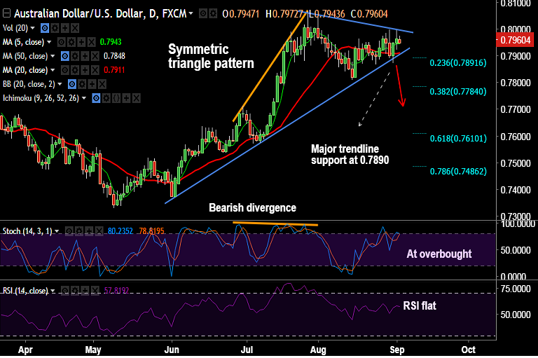 Resistance levels - 0.7961 (weekly 200-SMA), 0.7995 (Aug 30 high), 0.80 (trendline)