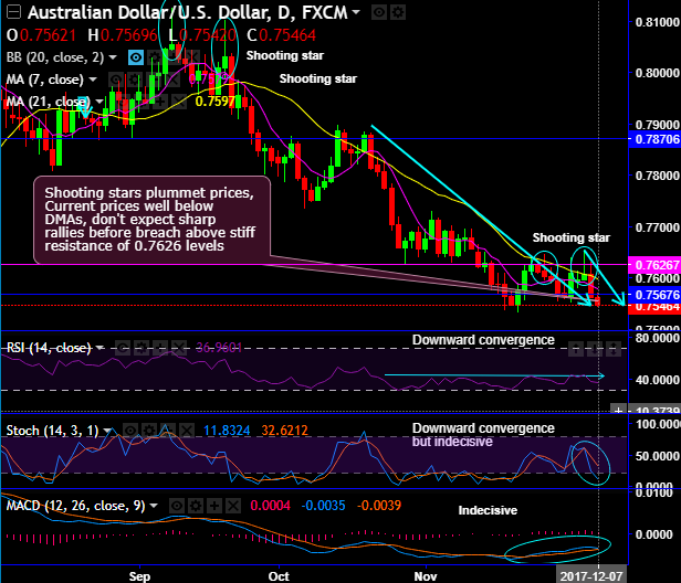 For now, the current prices well below DMAs, bearish DMA crossover signals extension of dips, don't expect sharp rallies before a decisive breach above stiff resistance of 0.7626 levels.
