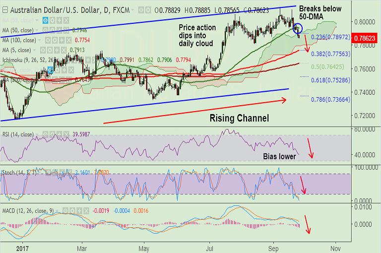 - AUD/USD price action has dipped into daily cloud, extends downside after breach at 50-DMA.