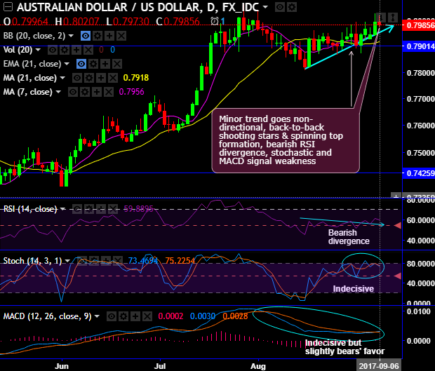 AUDUSD has seemingly moved in non-directional trend after brief downtrend in the recent past. Consequently, bears have managed to show their effects by forming shooting star and spinning top patterns on daily terms (refer rectangular area on daily chart). The strong support is tested at 0.7875 levels.