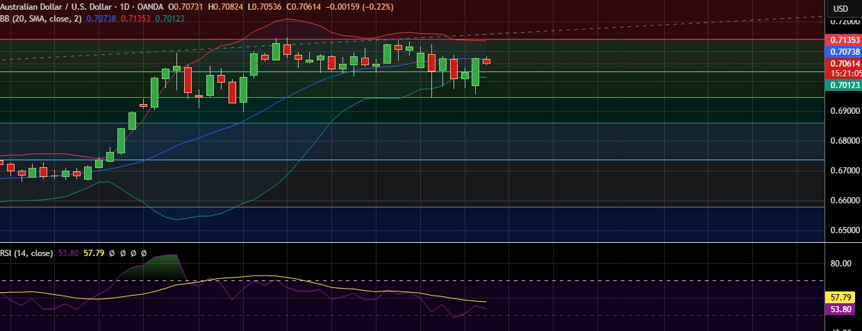 • Support is seen at 0.7034 (38.2%fib) and break below could take the pair towards 0.7017(50%fib)