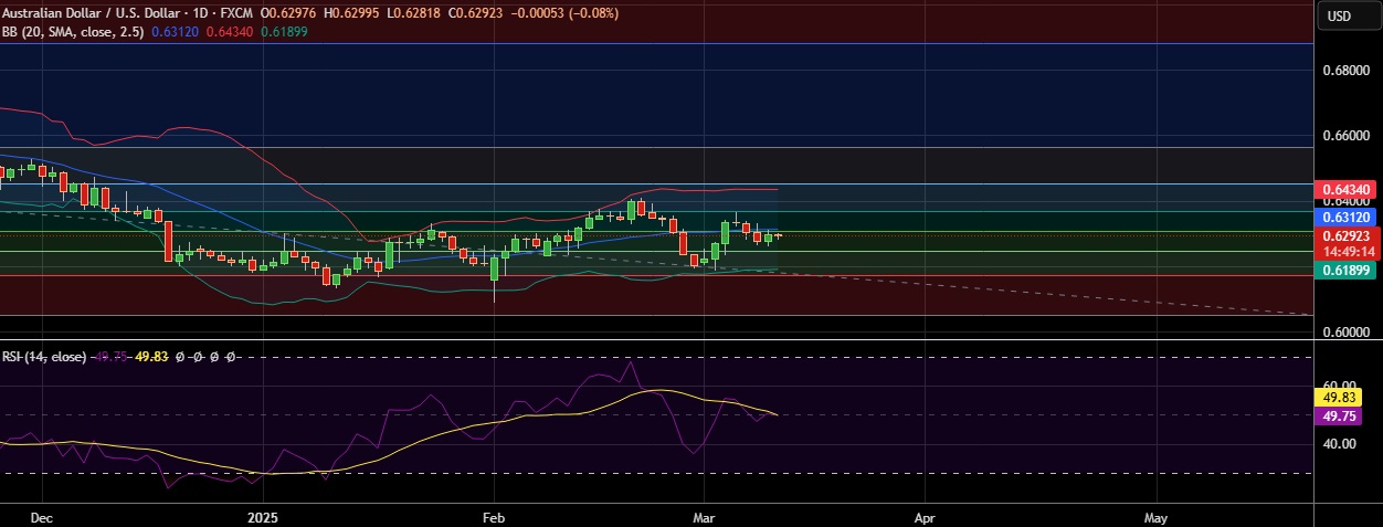 • Support is seen at 0.6246 (38.2%fib) and break below could take the pair towards 0.6192(Lower BB).
