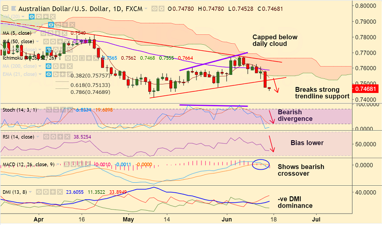 - On the flipside, break above 0.7525 (trendline support turned resistance) could negate bearish bias.