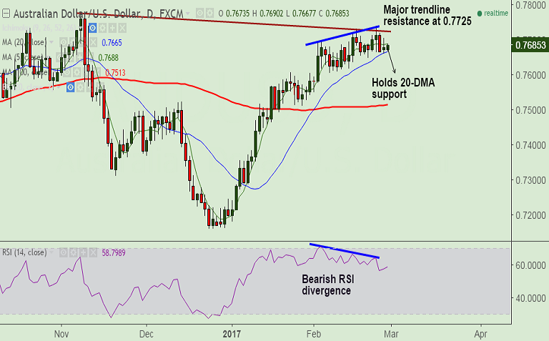 Support levels - 0.7665 (20-DMA), 0.7603 (23.6% Fib retrace of 0.7161 to 0.7740 rally), 0.7550 (Feb 1st low)