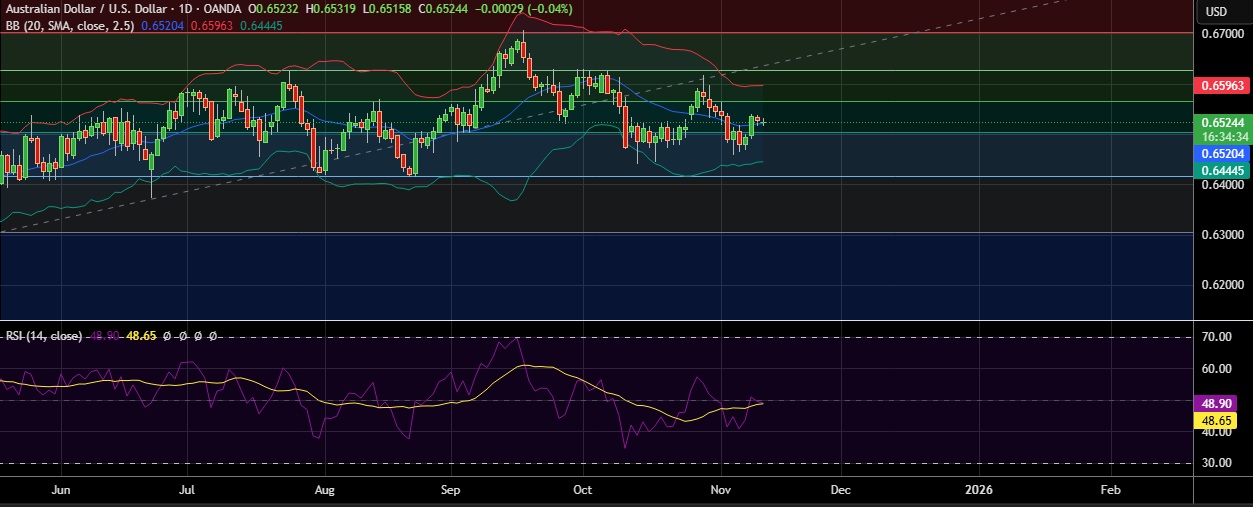 • Support is seen at 0.6508 (61.8%fib) and break below could take the pair towards 0.6446 (Lower BB).