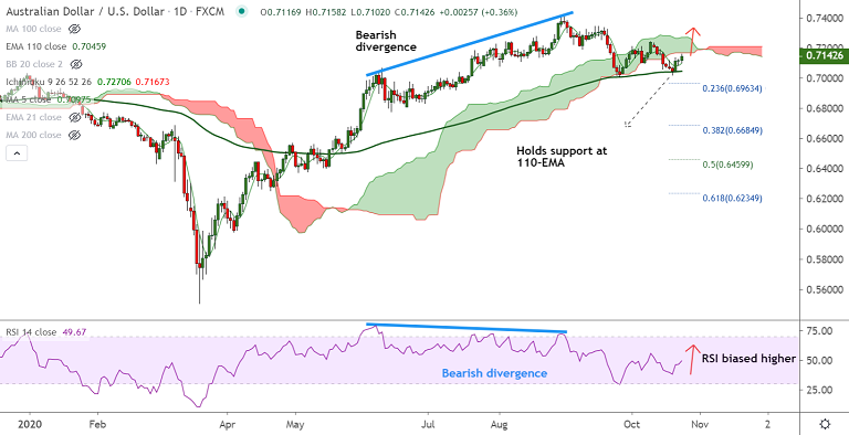 AUD/USD was extending bounce off 110-EMA support, gains for the 3rd straight session.