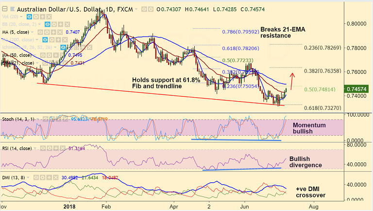 Support levels - 0.7431 (21-EMA), 0.7408 (5-DMA), 0.7327 (61.8% Fib), 0.73