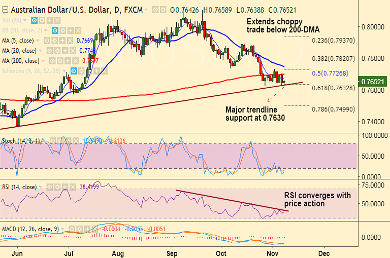 - AUD/USD is extending choppy trade below 200-DMA at 0.7697 which is major resistance.
