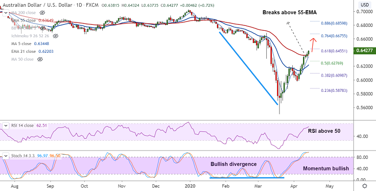 Technical bias for the pair remains bullish. Price action has broken above 55-EMA resistance.