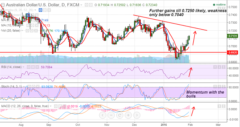 - Technicals indicate further upside for the pair, bias is higher, Stochs,RSI and MACD point north, gains upto 0.7250 likely.