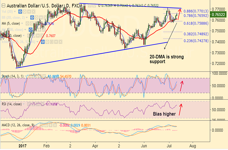 Support levels - 0.7617 (5-DMA), 0.7607 (20-DMA), 0.7588 (61.8% Fib of 0.7749 to 0.7328 fall)
