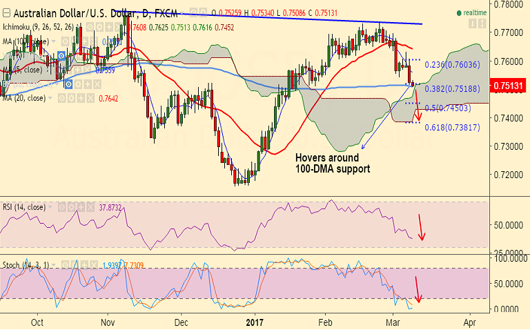 - Immediate support lies at 0.7510 (100-DMA), break below will see further downside.