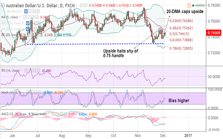 - The pair now finds stiff resistance by 20-DMA at 0.7476, any upside can be seen only on break above.