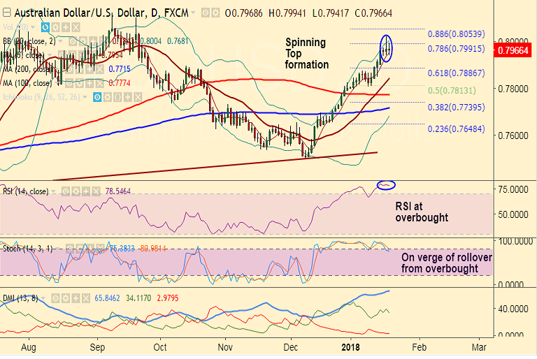 - Upside stalls shy of 0.80 handle, back-to-back spinning top formations at highs raise scope for downside in the pair.