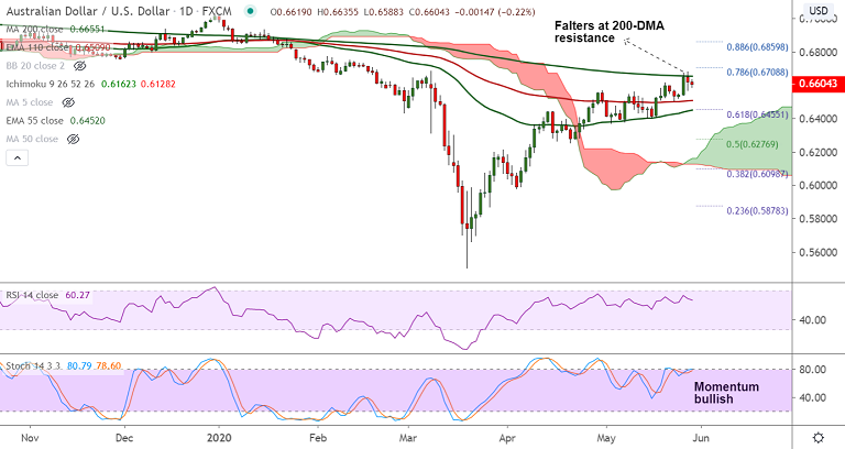 The pair has been rejected at 200-DMA resistance and 'Spinning Top' formation on Wednesday's candle dents upside.