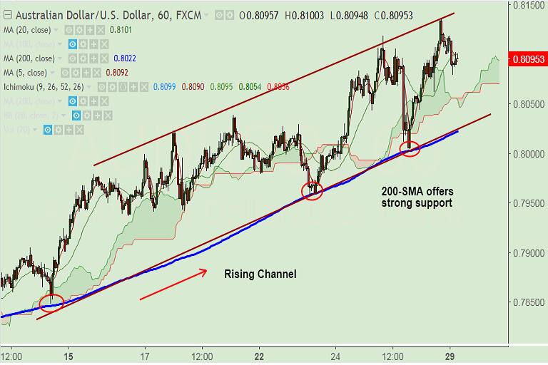 - We see major support at 1H 200-SMA at 0.8022. The pair has bounced off several times. Weakness only on break below.
